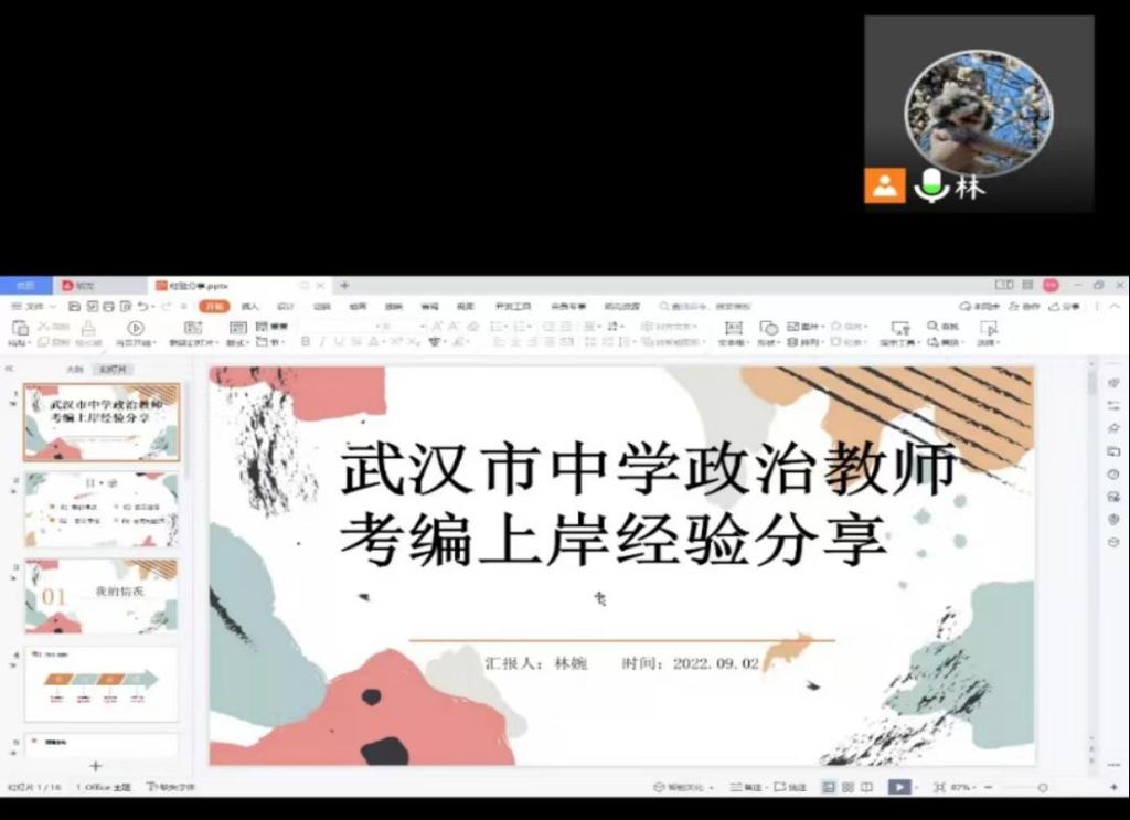 9月2日晚19点30分,中心和马克思主义学院邀请2019级学科思政专业校友林婉在线开展武汉市教师编制考试经验分享会,并就2022年武汉市中学教师招聘形势进行分析。中心骨干教师、教育硕士专业学位负责人姚迎春副教授、20级和21级学科思政研究生共100余人参加此次分享会。分享会由姚迎春主持。